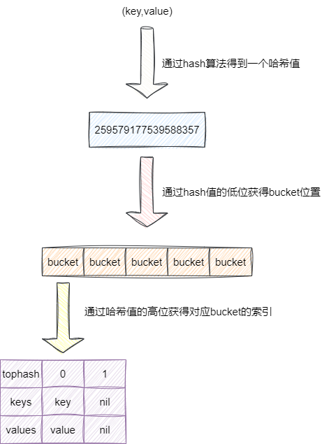 映射底层实际是通过对key的hash计算得到一个哈希值,然后通过哈希值的低位决定键值对落到哪个桶上。随后再根据哈希值的高8位定位到bucket中tophash、key、values的索引位置,我们假设高八位计算后为0,那么这就取这三个数组的0索引位置。