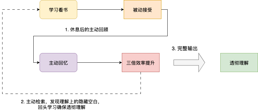 杰哈的实验显示,主动回忆法的记忆效率是被动看书的三倍,因为主动回忆能激活大脑的检索记忆功能,让知识点记得更牢固。同时结合费曼学习法的观点,主动输出还能发现自己理解上隐藏的空白,进而有针对性地深入研究,透彻理解知识。