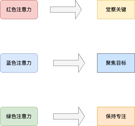 理解了大脑的注意力机制后,我们来认识杰哈博士提出的注意力三色理论:注意力分为三种颜色,每种对应不同的功能和训练重点。