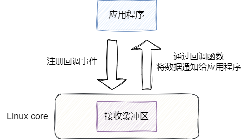 而异步则是应用程序到系统内核获取就绪数据时,若没有数据则直接返回并注册回调,当有就绪的数据时,直接通过回调通知进程: