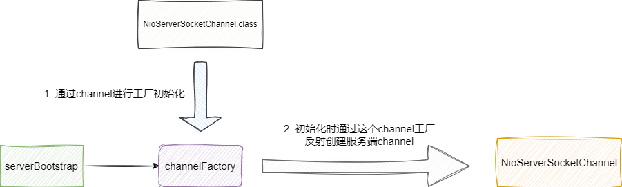可以看到Netty对于IO模式的切换只需在channel上进行简单的配置即,这一点它是如何设计与实现的呢?本质上channel方法采用的泛型抽象+工厂模式并结合反射这种理念,在配置引导类时,通过channel方法传入不同的IO模式策略class,其内部会基于这个class将其封装为channel工厂,后续服务初始化时就会基于这个channel工厂通过反射的方式生成服务端channel: