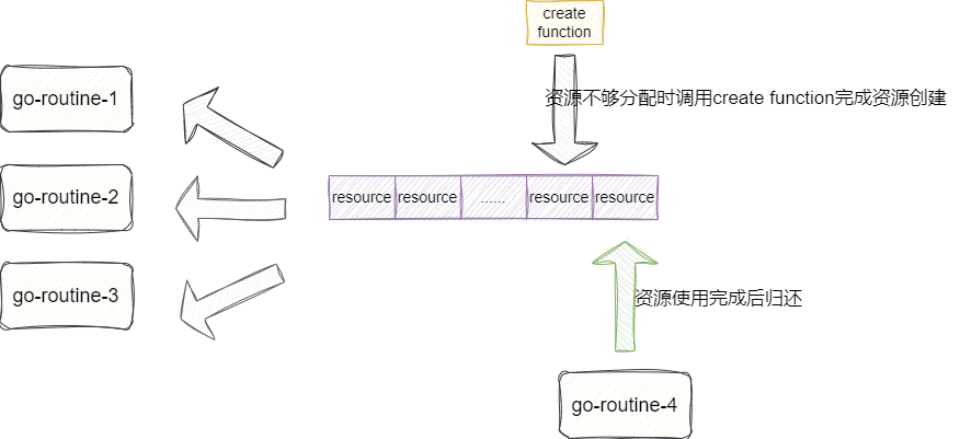 当协程需要获取资源时,会查看当前缓冲通道是否有足够的资源,如果有则在正确运行的情况下返回出去,反之基于我们上文传入的工厂方法完成资源创建并返回: