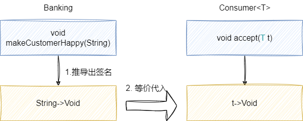分析抽象方法makeCustomerHappy的定义,要求传入String返回void,由此我们按照函数式编程的套路得出可能要用到的函数式接口的函数描述符为:(String)->Void,于是我们得到了一个JDK8自带的接口Consumer,它的函数签名为(T)->Void,注意这个T是泛型,所以我们完全可以将String类等价代入: