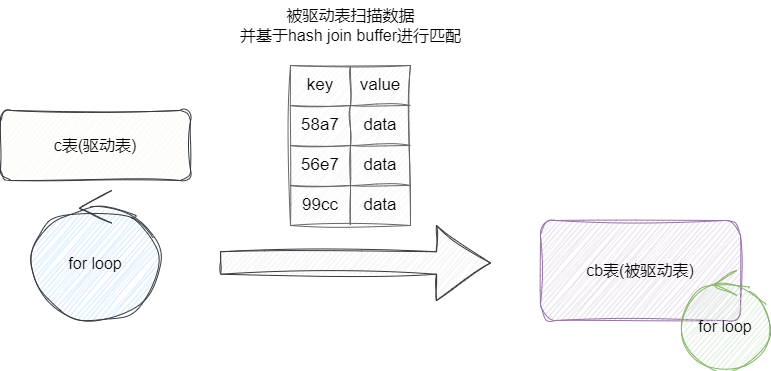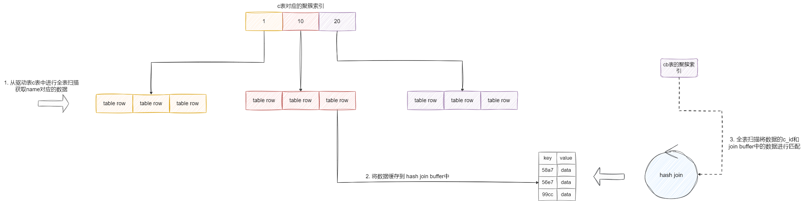 以我们的SQL为例该查询首先查询驱动表c,它会基于where条件进行全表扫描获取数据,基于查询结果缓存到hash join buffer再到关联表即被驱动表的聚簇索引进行全表扫描匹配结果: