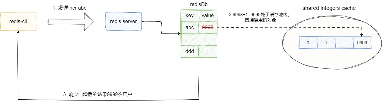 针对字符串类型(可以转数值的情况下,它也会转数值类型),我们都是通过robj类型创建和维护,因为我们本次所复刻的incr和decr所操作的类型是字符串中可转为数值的对象,所以本着数值类型有迹可循的规律以及空间换时间的思想,我们提出池化思想,即将0-9999数值缓存一份数值池,后续的增减操作后处于该范围的数值都可以直接使用数值池里对应的robj对象,以节约robj对象创建的开销和非必要的内存资源占用: