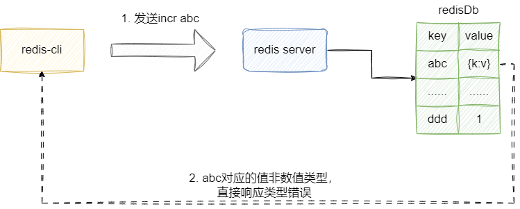 因为指令是基于字符串操作的,所以在执行INCR或者DECR之前我们都必须针对入参的键值对进行校验,所以对于以下情况,我们都必须采用fail-fast的方式提前将失败暴露,将键值对已存在,对应的值非字符串类型(例如:字典类型),直接响应错误: