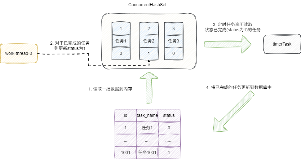 - 从数据库读取未完成(status为0)的任务,将其采用并发容器(ConcurrentHashSet)存放,key为这个任务对象