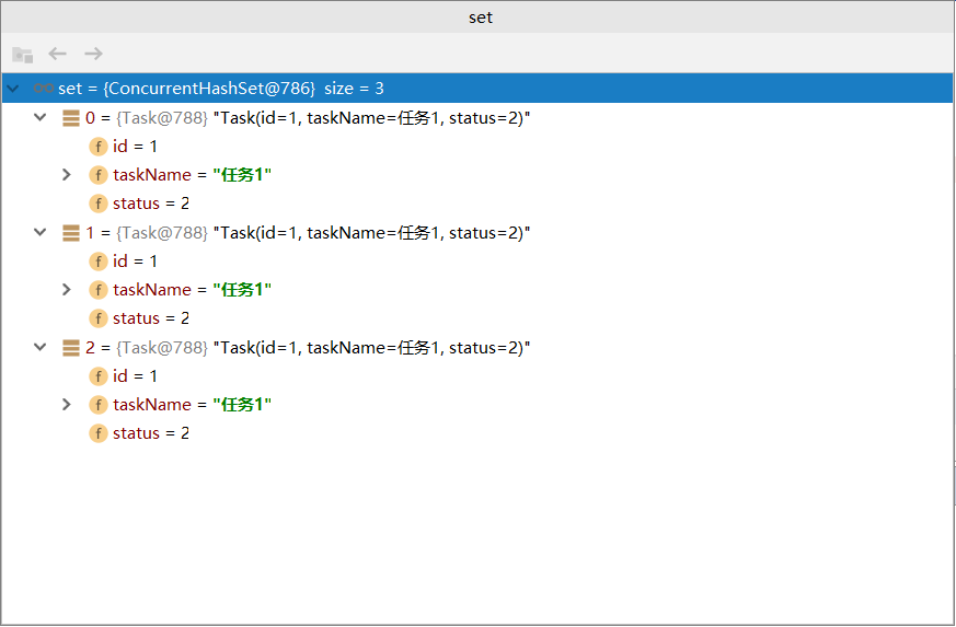 调试查看set内部,3个元素都指向我们的唯一的任务-1。