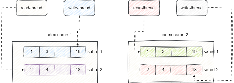 这种设计依然存在并发场景下大量请求读写导致资源争抢而阻塞,所以lucene通过index name区分不同的lucene完成缓解并发读写的压力: