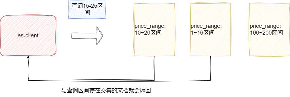 例如我们的索引中的创建一个数值类型price_range,创建一份文档的区间是10~20,如果此时我们查询的数值为15~25,那么10~20这份文档就会返回: