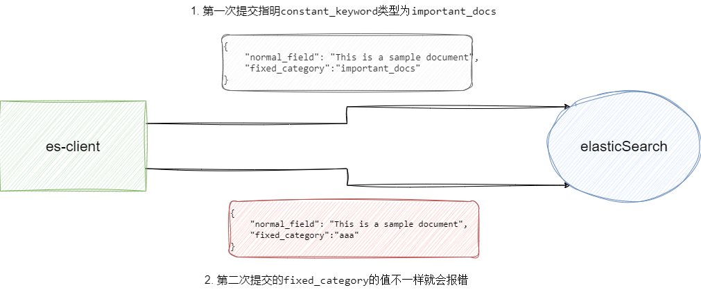 例如笔者现在创建一份ck_index文档,指明fixed_category为constant_keyword,第一次提交或者默认创建索引时指明值为important_docs,那么后续只要fixed_category提交的值不是important_docs,就会报错: