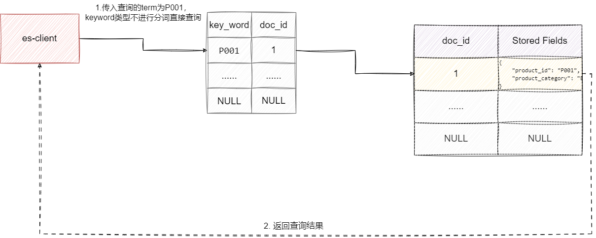 精准匹配就是用于精确查找数据,例如我们创建一个key_word_index这个索引,该索引包含product_id和product_category两个字段且都是keyword类型,进行查询时我们无论传入任何文本参数,es都不会进行分词,而是原原本本的基于这个分词返回查询结果,如果比对没有一致的,那么就说明索引中没有对应的文档: