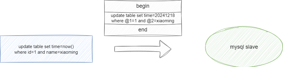 如果我们将其存到bin log之后很长一段时间才提交事务,那么时间就会有所延迟,所以MySQL为了保证数据实时性,就会将写入bin log中的SQL用row格式,如下图所示,可以看到row格式的SQL语句时间是当前时间的具体值,并且where条件写死了当前条件列,确保数据实时一致性:
