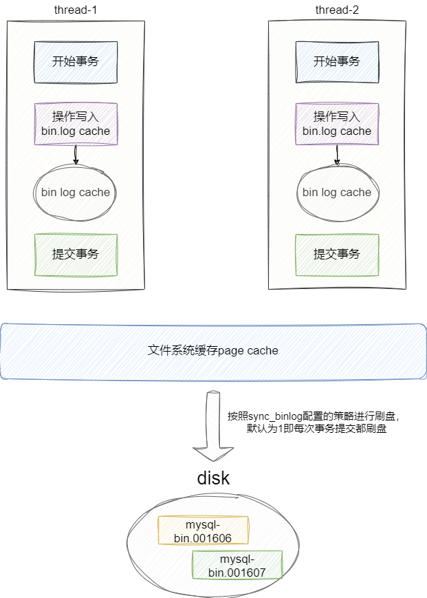 当我们开始事务时,将修改写入bin log cache中,一旦事务提交,就会将bin log通过write写入到文件系统缓存的page cache中,然后根据我们配置的刷盘参数将cache内容调用操作系统内核方法fsync将结果写入到bin log 物理文件中: