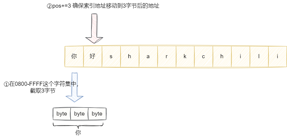 以上我们迭代的例子,在迭代时go语言就会走到decoderune函数,初次迭代时会从字符串数组索引0即"你"这个字符串开始,判断该数组位置字符大小,如果在0800-FFFF之间,说明底层要截取3个字节才能正确拿到该元素,decoderune就会截取3字节后得到一个字符(用go的术语叫rune),并将pos加上3确保偏移到下个字节的起始位置: