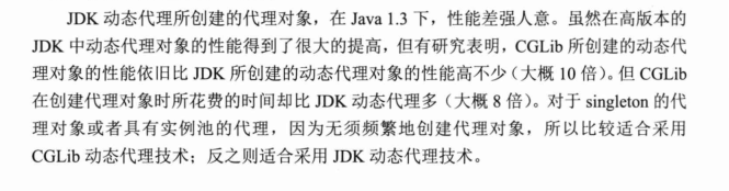 在《精通spring4.x》一书中,我们可以知道,jdk生成的代理对象性能远远差于cglib生成代理对象,但cglib创建代理对象花费的时间却远远高于jdk代理创建的对象。所以在spring框架的使用中,如果是单例的bean需要实现aop等操作,我们建议是使用cglib动态代理技术: