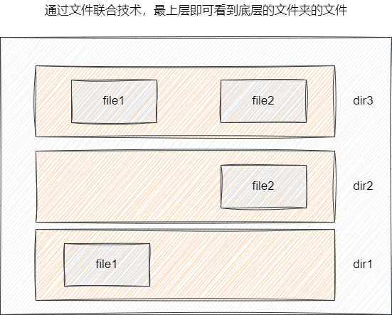 例如我有有一个文件夹dir1里面有文件file1。还有一个文件夹dir2,里面有文件file2。通过联合文件系统我们就可以使得在最上层的文件夹dir3看到这两个文件夹的文件。