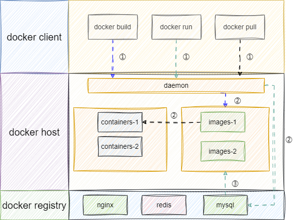 先来说说docker build,它会根据我们定义好的Dockerfile 读取相应的文件生成镜像存储到镜像库中,假如我们需要让这个镜像运行,只需用docker run命令指定这个程序,docker就会从注册表提取镜像,然后创建一个新的容器,并为这个容器创建读写文件系统,然后分配网络再启动,这个容器也就是一个docker进程。 假如我们希望获得别人的镜像文件,例如nginx官网提供的nginx镜像,我们就可以用docker pull从docker注册表中获取对应的镜像信息,然后拉取镜像存储到我们自己的镜像库。