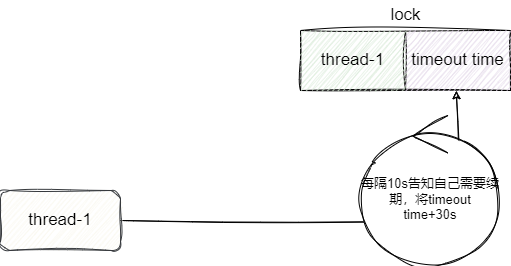 例如上文中的线程1持有锁之后,会基于当前时间+30s得出锁到期时间,随后在这个需求的三分之一也就是每隔10s向redis表明自己还存活着,不断延长自己的到期时间,知道线程1完成后主动释放这把锁: