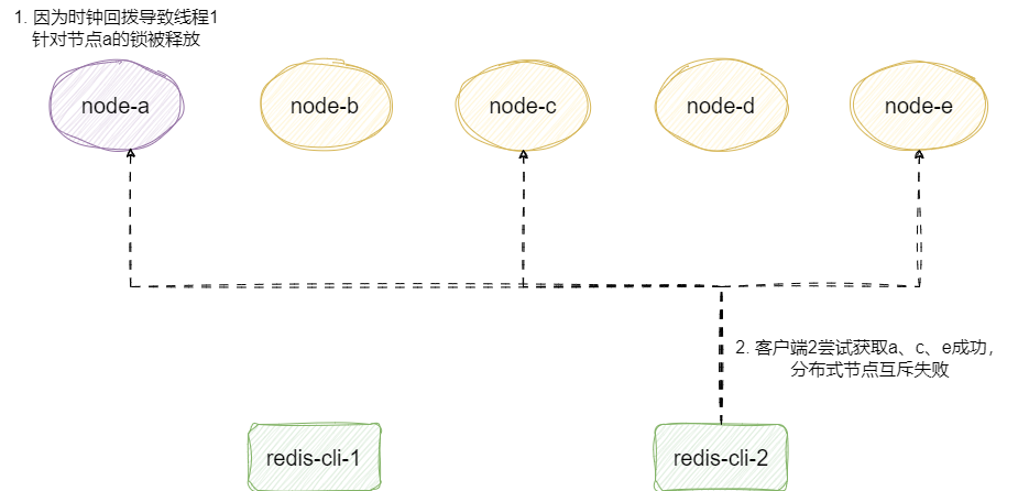 - 还是以上述的部署架构为例,假设线程1针对a、b、d上锁成功,此时a节点因为某些原因将时钟向前调整了一些,导致a节点提前超时,线程2基于a、c、d还是会拿到分布式锁,又一次导致互斥失败: