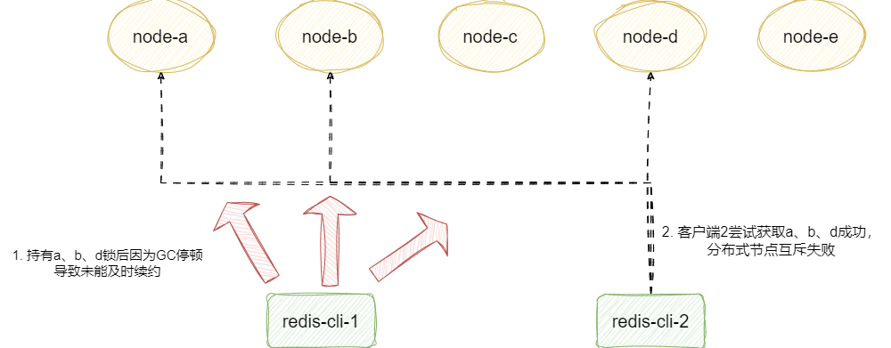 - 假设我们有一组redis集群,集群中有5个节点分别是a、b、c、d、e,现在有两个线程尝试获取红锁,线程1先到达,成功获取到a、b、d 3个节点的锁,假设在此期间线程1在使用分布式锁因为程序STW等原因导致系统阻塞未能及时续约,线程2在此时就可以同时获取到a、b、d3个节点的分布式锁,导致锁互斥失败: