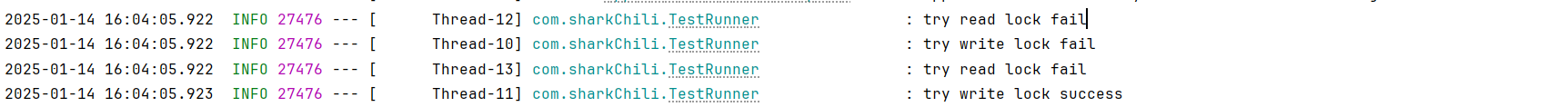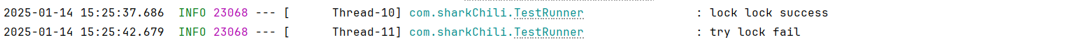 对应的输出结果如下,可以看到第一个线程基于redisson上锁成功后,第二个线程就无法上锁了: