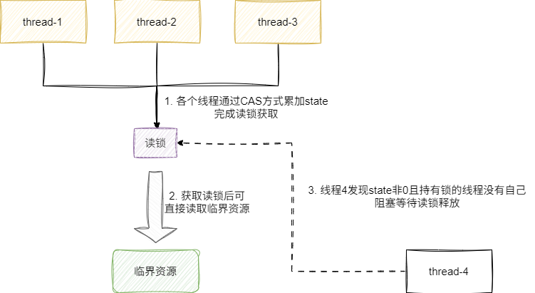 - 如果没有其它线程获取读锁,则直接上互斥独占的写锁,若其它线程上了读锁,则等待其它线程释放读锁后,保证可独占的情况下获取写锁