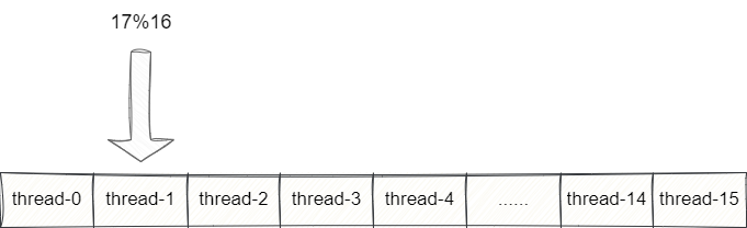 假设我们的计算的值来到16,按照取模算法它对应的索引为0,此时新来一个事件需要线程处理,于是原子类原子自增1得到17,通过取模运算最终得到索引1: