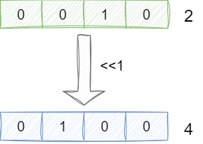 移位运算从工作的角度来看就是直接将所有位置的数字简单移动x位,这个x就是我们要移动的位数,假设我们二进制数2,对应二进制就是0010,通过移位运算<<1得到的结果就是4,不难看出移位运算移动x位,就相当于乘2x的数学运算,同理右移运算就相当于除法,这里就不多做赘述了: