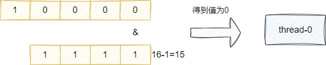 举个例子,假设当前索引值还是16,也就是的4次方,换算成2进制就是10000,然后2的次幂减去1即可得到小于2的次幂且低位全为1的二进制1111,这样一来我们idx无论怎么变化和这个减去1后的结果都会得到1个小于2的次幂,这个值永远小于等于线程索引。