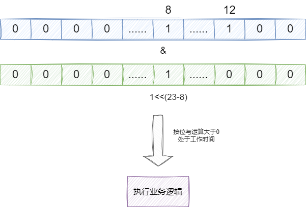 这里笔者给出一个比较经典的例子,假设我们的功能支持在8点到10点才能运行,我们希望能够判断当前时间是否是工作时间,这时候我们可以使用3个字节的byte做到这一点,我们使用24