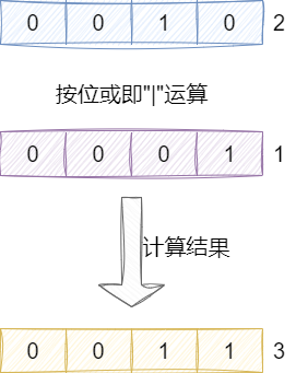 在二进制运算之中,按位或运算只要是1个bit上为1,那么运算结果就为1,如下图所示,可以看到2的二进制数和1的二进制数的按位或运算结果就是3