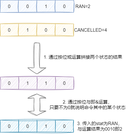 RAN的值为2,CANCELLED的值为4,对应的是二进制的低二位。 - 通过或运算,将这两个状态的值拼接起来,构成