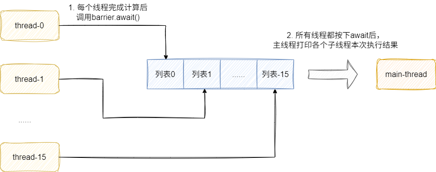 //完成负责列表元素计算后,通过屏障等待所有线程完成