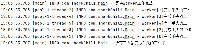 对应的我们也给出输出结果,可以看到主线程在线程池线程完成后才输出: