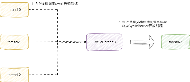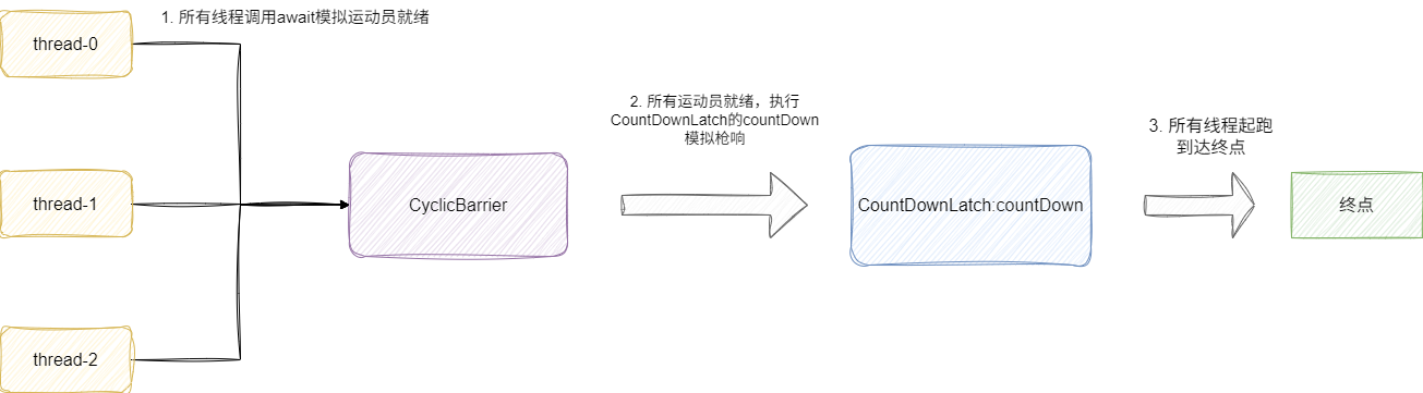 - 线程2才到达await,此时已经countDown,在上述线程完成比赛后才到终点