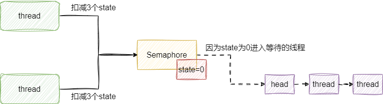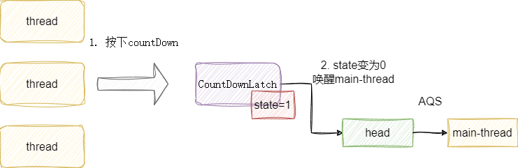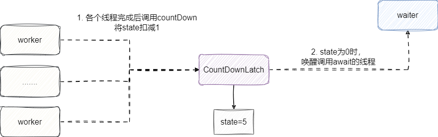 我们以等待所有工人完成工作的例子进行解析,实际上在CountDownLatch是通过state和一个抽象队列即aqs完成多线程之间的流程调度,主线程调用await方法等待其他worker线程,如果其它worker线程没有完成工作,那么CountDownLatch就会将其存入抽象队列中。