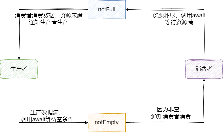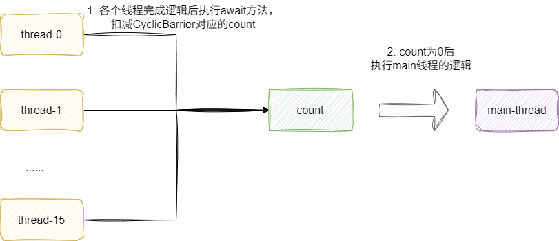 以上面并行核心线程运算逻辑为例,本质上await方法调用后底层就会完成count扣减,当count为0后就会触发一次主线程逻辑调用,也就是我们的打印输出,即通过count来完成线程之间的循环并发流程阻塞和通知: