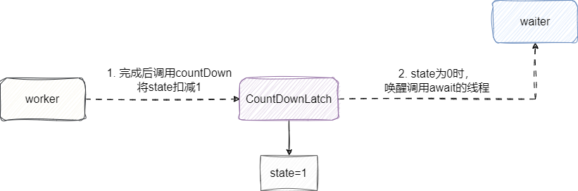 笔者一般称CountDownLatch为倒计时门闩,它主要用于需要某些条件下才能唤醒的需求场景,例如我们线程1必须等到线程2做完某些事,那么就可以设置一个CountDownLatch并将数值设置为1,一旦线程2完成业务逻辑后,将数值修改为0,此时线程1就会被唤醒: