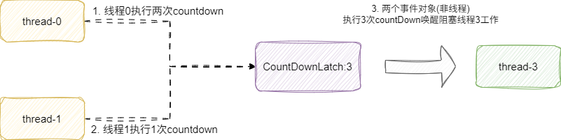 基于上述的例子,我们不难看出CyclicBarrier 与CountDownLatch在使用维度和工作理念上的区别,在执行层面上,CountDownLatch针对的是事件而非针线程,即通过事件对象countdown结束阻塞,即针对CountDownLatch指定次数n并非需要n个线程把控,例如CountDownLatch设置为3,即使只有两个线程也依然可以释放CountDownLatch这个闭锁从而唤醒阻塞线程: