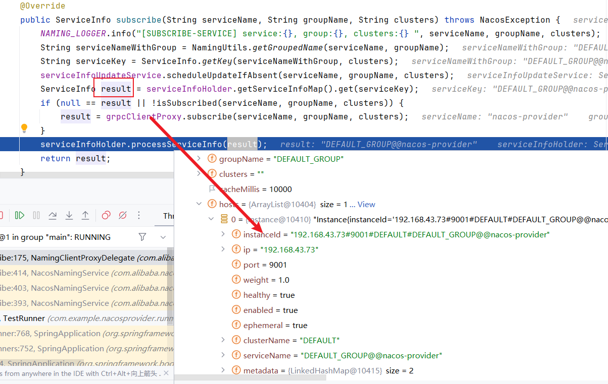 默认情况下,我们的缓存是没有订阅服务的信息的,所以会触发RPC请求,然后nacos就会返回当前服务的元信息,如下便是从nacos服务端返回的nacos-provider实例节点信息,后续如果需要调用,都会基于这份元信息发起请求: