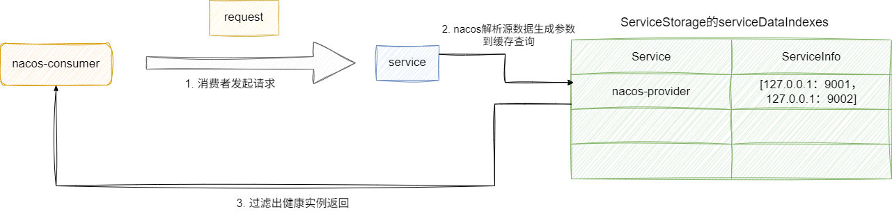 serviceStorage管理的缓存serviceDataIndexes中查询出对应服务实例即nacos-provider的所有实例信息。 - 过滤出有效即健康可用的实例响应给客户端。
