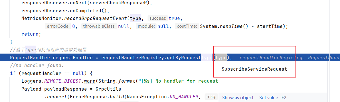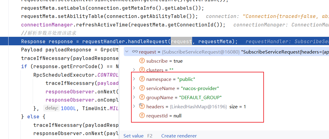找到对应的处理器SubscribeServiceRequestHandler之后,grpcCommonRequestAcceptor会从RPC请求报文中拿到参数交由该处理器进行处理:
