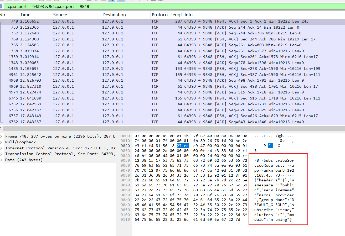 我们也可以通过抓包工具看到这个请求的详细内容,如下图所示,可以看到笔者基于nacos客户端端口64393作为源端口号,nacos服务端端口号即9848作为目的端口进行抓取捕获到的TCP网络包,可以看到这个订阅的RPC接口请求参数详情: