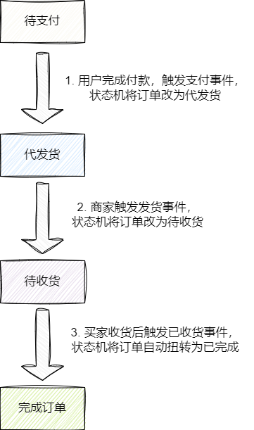 - 最终,买家收获之后触发已收货事件,订单变为终态已完成。