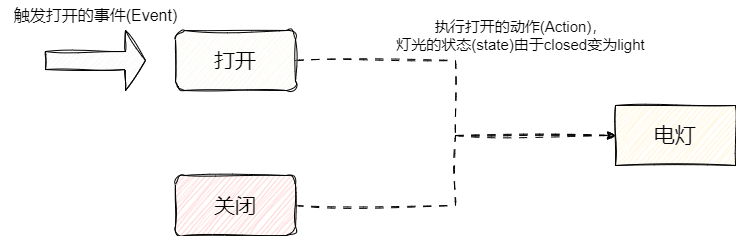 我们以一个简单的开关灯为例子简单介绍一下状态机的基本概念,当我们点击开时电灯就会亮起状态就是open,按照状态机的几个核心概念: