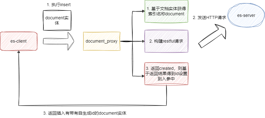 在用户使用的角度,看起来像是操作MP一样,实际上在执行insert方法时,Easy-Es底层也是和Mybatis类似,用到动态代理的机制,通过扫描实体类信息获得索引名称,然后构建restful风格的API请求执行文档插入,完成后直接将生成的id结果设置到组装实体中,并返回操作成功数: