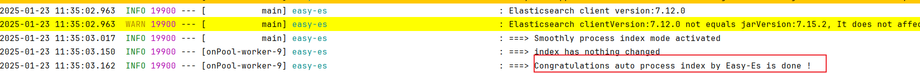 完成上述配置之后将项目启动,如果输出Congratulations auto process index by Easy-Es is done !则说明文档自动创建完成,此时我们就可以开始基本操作了: