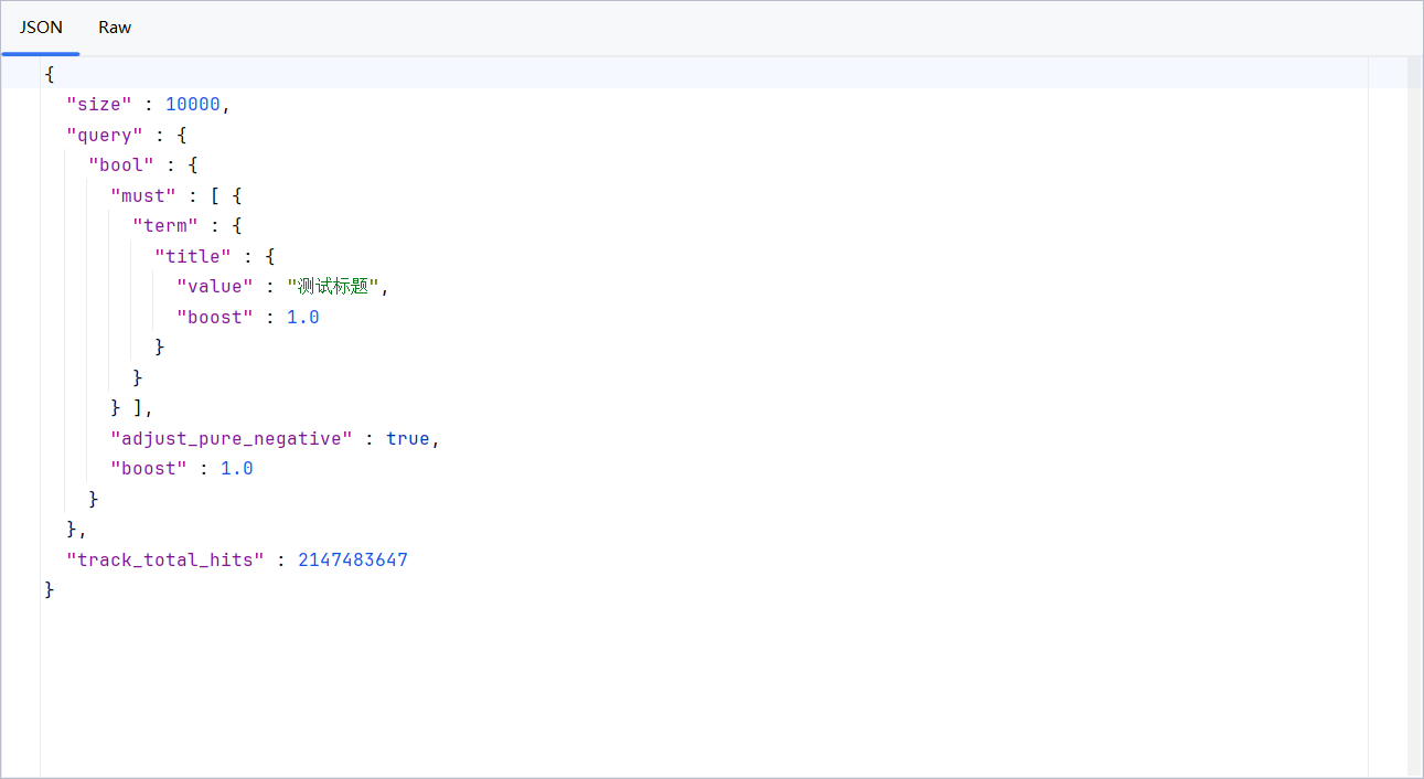 这里我们查看eq函数的底层实现可以看到实现精准匹配本质上就是通过must查询term为测试标题的文档: