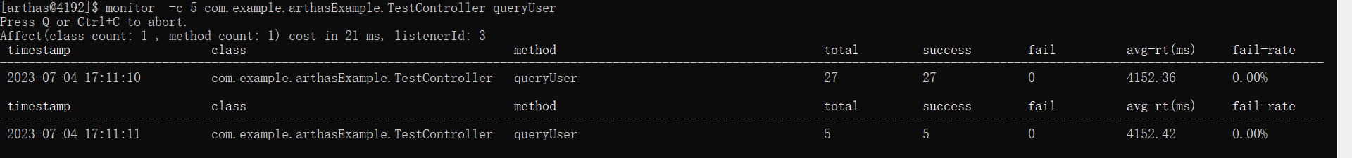 有时候我们希望监控某个方法单位时间内请求的耗时和调用情况,我们就可以使用monitor命令,例如我们希望每5s查看TestController 的queryUser的情况,我们就可以键入: